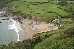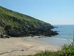 Author David Clegg describes the beach as "small and sandy and just one lovely granite cottage",[2] while the Rough Guide to Britain notes the rocky outcrops, inlets and coves in the vicinity.[3] 0.75 miles (1.21 km) to the east is Lambsoden Cove, accessed via a coastal footpath. There is an estate there with 70 acres of farmland.[4] Nearby is Dead Man Point.[5]