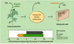 The main cause of the environmental footprint for hempcrete comes from the production of the binder. Reports have estimated that 18.5% - 38.4% of initial emissions from binder production can be recovered through the carbonation process.[7] The specific amount of carbonates in the blocks actually increases with the age of the block.[6] During the growth of hemp the plant absorbs CO2, the binder begins to absorb CO2 after the mixing process, and the wall absorbs CO2 counteracting the greenhouse emissions, by acting as a carbon sink.[6] A hempcrete block will continue to store carbon throughout its life and can be crushed and used again as a filler for insulation.[6] The amount of CO2 capture within the net life cycle CO2 emissions of hempcrete is estimated to be between -1.6 to -79 kg CO2e/m2.[7] There is a correlation that increasing the mass of the binder which increases the mixture density will increase the total estimated carbon uptake via carbonation.[7]