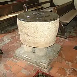 Hempton has a former nonconformist chapel that is said to have been opened in 1840.[1] It ceased to be used for worship in the 1950s and is now a private house. The Church of England parish church of St. John the Evangelist was completed in 1850[2] or 1851.[1][3] Rev. William Wilson of Over Worton designed the Gothic Revival building[2][3] and funded its construction.[1] The building has Early English style lancet windows and a two-bay north arcade that led to a schoolroom.[2] The church's font is a Norman one from Holy Trinity parish church, Over Worton.[1][2][3] In its early decades St. John's was a licensed but unconsecrated chapel and independent of the Benefice of Deddington,[1] but is now part of the benefice.