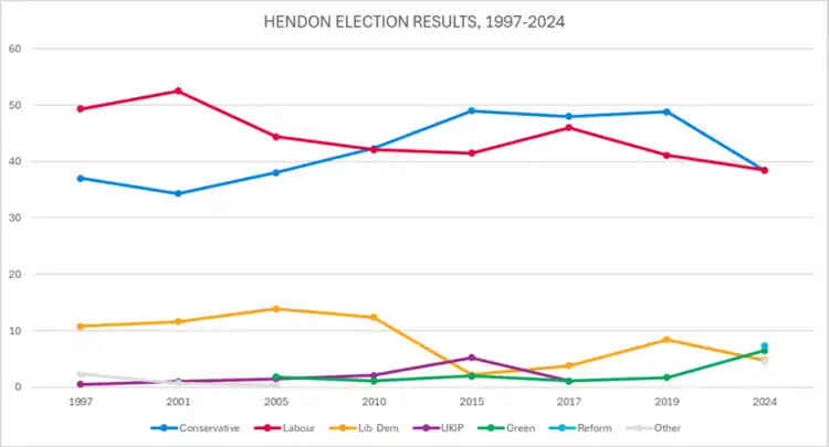 Including the period of division of the present area (1945—97) the various general elections up to 1997 were won by Conservatives, except for the 1945 victory of Barbara Ayrton-Gould (Labour), in Hendon North (1945–50). The last Liberal or Liberal Democrat to serve the area of either Hendon seat was in 1910. Only these three parties have won the seat or its predecessors.