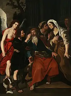De Somer is believed to have been in contact with Matthias Stom during the latter's stay in Naples in the 1630s. Hendrick's works such as Caritas Romana (1635, private collection) and Tobias curing his father's blindness (c. 1635, Banco Commerciale Italiana, Collezione Intesa Sanpaolo) can be seen as de Somer's reaction to the northern realism of Matthias Stom.[12] In later compositions de Somer reflects influences deriving from the example of other Neapolitan masters who asserted themselves in those years, such as Massimo Stanzione and Bernardo Cavallino. Hendrick's palette moved gradually away from the tenebrism of Ribera and opened up to the neo-Venetian color, which in that period came to replace the chiaroscuro of the Caravaggisti.[6] Works like his multiple versions of Lot and his daughters and his Samson and Delilah are examples of this evolution.[12]