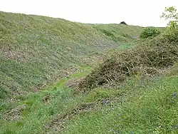 In Iron Age Britain around 700 BC, a settlement on the Head was established;[29] also around this time, the headland was cut off from the mainland by the construction of two banks and ditches called the Double Dykes, similar to those found at Maiden Castle.[30] The earthworks consisted of an inner bank three metres high, with a ditch three and a half metres deep. An outer ditch six metres wide and two metres in depth is now obscured due to wind-blown deposits of sand and a gradual silting process.[31] These defences turned Hengistbury Head into a fortified settlement area which seems to have grown over succeeding centuries until it became an important port.[32] The Iron Age port at Hengistbury Head forms a final site in a small chain of fortified earthworks, starting from Hambledon Hill, and also including Hod Hill, Spetisbury Rings, Buzbury Rings, Badbury Rings and Dudsbury Camp.[33]