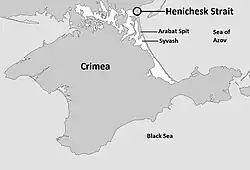 The Henichesk Strait (alternatively Genichesk Strait; Ukrainian: Генічеська протока, Crimean Tatar: Ceniske, Cengięke, Russian: Генический пролив,) is a narrow strait which connects the Syvash (the shallow lagoon system separating the Crimea from the rest of Ukraine east of the Isthmus of Perekop) with the Sea of Azov. It separates the Arabat Spit from the Ukrainian mainland.[1]