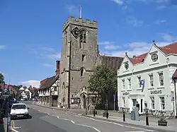 Although the castle no longer remains, several other historical buildings and structures still exist in the town, such as the parish churches of St. Nicholas and St. John the Baptist, the 15th century Guildhall (which has been restored), the medieval market cross (much of the decoration of whose shaft has been mutilated but which has three ranges of kneeling places and sculptures representing the Holy Trinity, the crucifixion of Jesus, and, it is believed, St Peter), the 16th century White Swan, and several half timbered residences along High Street, the main street of the town.[7][8]