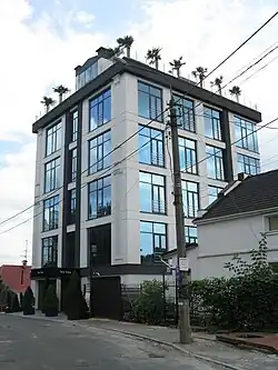 The New York House is a residential building located in Kyiv at 60 Redutna Street. The building was constructed in 2015 with the involvement of businessman Hennadiy Balashov. The house has a total project area of 2333.3 m2 and consists of 8 apartments with an average area of 140 m2.[15] Construction on Redutna Street has faced significant criticism from the community due to numerous violations of building codes and legislation, particularly in an area of historical and cultural value. According to Ukrainian cultural heritage protection legislation, high-rise construction is prohibited here; however, despite this, new residential complexes have begun to appear in this area.[16] As of 2021, the construction of the New York Club House and other projects on Redutna Street are under scrutiny and protests from local residents concerned about potential safety and stability issues for neighboring buildings due to possible landslides.[17][18]