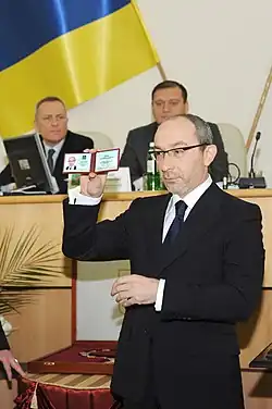 Following the Revolution of Dignity, after he and the governor of Kharkiv Oblast, Mykhailo Dobkin, had briefly found refuge in Russia,[18] Kernes was accused of alleged connections to death threats, kidnapping and torturing of participants of Euromaidan in Kharkiv and was subsequently placed under night-time house arrest.[14][19][20] This criminal case against him was dropped on 30 July 2014 "due to the serious illness of the suspect".[21][22] He was accused, in February 2014, by the post-revolutionary leadership of promoting separatism.[16] However, since then he was believed to have softened this position,[16] pivoting to support an undivided Ukraine in line with Kyiv.[23] In March 2014 he stated that he had been a "prisoner of Yanukovych's system" and that he expected "good things to come" from the new Yatsenyuk Government.[24]