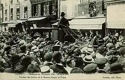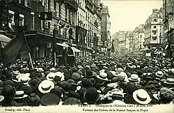 On the day itself, a procession of several tens of thousands of people accompanied his body from his former workplace, at 127 rue du Faubourg Saint-Antoine, to the Pantin cemetery.[3] The gathering quickly became very insurrectionary; the crowd fought with the police, police stations along the route were pelted with stones, and non-strikers and those who refused to uncover their heads before the body were attacked.[1] Several police officers were injured, and one of them was even stabbed.[1] The most violent clashes took place in front of the cemetery, where the police carried out cavalry charges into the crowd with their sabres. In total, over forty police officers were injured, and about a hundred demonstrators received sabre cuts; the pavement was left covered in blood.[1][3] According to some police witnesses and residents of Pantin, these were the most violent riots in Paris since the Paris Commune, forty years earlier.[1]
