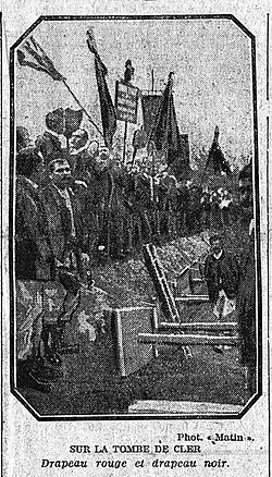Cler's death at the hands of the police caused an immediate shock in the faubourg, whose walls became covered with posters speaking of "employer and police assassination", and all Parisian trade union sections called for participation in his funeral, scheduled for 26 June 1910.[1] The workers' parties were opposed to such participation as they feared "outbreaks", but they were not listened to.[1]