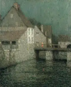 In 1895 Le Sidaner left Étaples and moved to a suburb of Paris where he became part of an artistic clique that included the musician Gabriel Fauré and the art dealer, George Petit, to whom Le Sidaner entrusted the sale of his future work. The move to Paris was likely made for career reasons. Le Sidaner much preferred a solitary existence in the French countryside. Whatever the prime reason the Paris stay was short but significant, as in 1898 he eloped to Bruges with the twenty two year old Camille Navarre, to whom he was subsequently married.[16] The success of the Belgian Les XX group of artists had positioned Bruges as a city that was responsive to new ideas and ways of thinking[17] and for Le Sidaner the years in Bruges were pivotal to his subsequent artistic career. It was in Bruges that Le Sidaner painted a series of nocturnes exploring the gloaming light around dusk. They possess a mysticism and convey the silence behind the walls and beneath the waters of Bruges' many canals.[2][note 3] La Tour, Bruges (1890) is a strong example of his Bruges period. The Tower is displayed against a sombre blue sky whose light is fading fast. The bottom of the picture is in darkness save for the favoured motif of two solitary lights through a window. In another twilight painting Crépuscule, Maisons Quai De Rosaire (1900)[18] the sombre palette is again off-set by the familiar motif of a lighted window casting its penumbra across the silent waters of the canal.