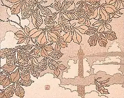 Rivière’s prints were generally intended to be published as collections. These include forty images used in Breton Landscapes, created between 1890 and 1894. He also made colour woodcuts for The Sea: Studies of Waves, and prepared other sequences that remained unfinished, including 36 Views of the Eiffel Tower, which were eventually published as lithographs. These were influenced by the vogue for Japonism at the time, modernising the famous prints by Hiroshige and Hokusai of 36 Views of Mount Fuji.[2][5]