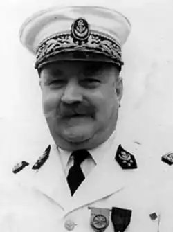 Following the occupation of France in 1940, Sautot declared the New Hebrides' allegiance to the Free French on 20 July, the first territory to do so.[1] On 13 September Charles de Gaulle appointed him Governor of New Caledonia.[1] He sailed to New Caledonia and, greeted by large crowds on his arrival, went straight to Government House and removed Colonel Denis from office.[1] He subsequently set up the Bataillon du Pacifique which sailed in May 1941 to fight in North Africa and Europe.[1] He was made a companion of the Order of Liberation on 1 August 1941, later also becoming a Commander of the Legion of Honour and an Officer of the British Empire.[2] However, after the new French High Commissioner in the Pacific Georges Thierry d'Argenlieu arrived in 1942, disagreements between the two led to Sautot being deported to Auckland in New Zealand in May 1942.[1]