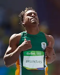 Henricho Bruintjies (born 16 July 1993) is a South African sprinter. He broke the 10-second barrier with a run of 9.97 seconds in 2015. He has represented his country at the Summer Olympics, World Championships and Commonwealth Games. He is a silver medalist in the 100 metres in the 2018 Commonwealth Games