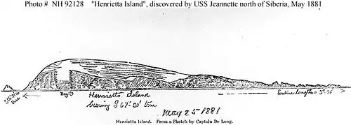 American explorer and US Navy lieutenant commander George W. De Long set out in 1879 aboard the Jeannette, hoping to reach Wrangel Island and to discover open seas in the Arctic Ocean near the North Pole. However, the ship entered an ice pack near Herald Island in September 1879 and became trapped. The vessel drifted several hundred miles with the ice, passing north of Wrangel Island. In May 1881 it approached Jeannette Island and Henrietta Island. According to The Annual Report of the Secretary of the Navy, for the Year 1882 (p. 16), "A sled party landed, hoisted the national ensign, and took possession in the name of the United States".[4][5] The excursion was led by George W. Melville, accompanied by William Dunbar, William Nindemann, Hans Erichsen, Walter Sharvell and James Bartlett. They landed on June 2 or 3, constructed a cairn, and placed inside it a record of their visit.[6]