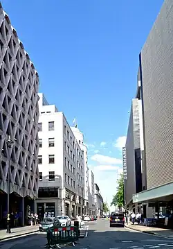 The south side of the street is dominated by the back of retail premises on Oxford Street such as the Debenhams and House of Fraser (previously D.H. Evans) department stores. The Debenhams store was built in the late 1960s or early 1970s to replace a Marshall & Snelgrove store on the same site.[9][10] Between them is the church of St Peter, Vere Street, a grade I listed building also known as the Oxford Chapel or the Marylebone Chapel, the architect of which was James Gibbs who also lived in the street.[1] Henrietta Passage once ran south into the centre of the buildings that were on the site now occupied by House of Fraser.