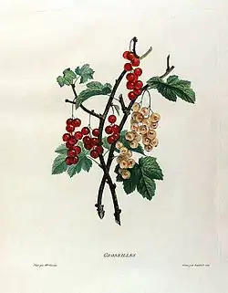 Henriette Vincent's magnum opus was Studies of Flowers and Fruits Painted from Life (original title: Études de fleurs et de fruits: Peints d'après nature). First published in Paris in 1820 with 48 hand-finished color engravings by Lambert the elder, it was republished the same year in London with hand-colored aquatints by T. L. Busby that reversed the images in the original volume. It was dedicated to "young women", presumably those who might follow in Madame Vincent's footsteps. The subjects of the watercolors included common flowers like tulips, pinks, narcissus, hyacinths, carnations, and anemones; the fruits depicted included grapes, cherries, plums, and strawberries. The finely detailed, naturalistic images typically show clusters of flowers and fruits with their leaves against a plain background and may be further particularized by such details as water droplets, a ladybug sitting on a leaf, or butterflies flitting nearby. Although not notable for scientific exactitude, Vincent's paintings continue to be appreciated as masterpieces of delicacy and beauty from the heyday of the florilegium.[6] Only five copies of the book are now known to exist; institutions holding copies include the British Museum and the Chicago Botanic Garden.[7]