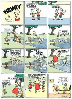 The daily strip went into reruns in 1995, and the Sunday strip in 2005.[1] After 84 years of syndication, Henry was discontinued on October 28, 2018.[2]
