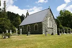 Acland was active in the Anglican Church, a member of the synod for many years and licensed as a lay reader.[1][22] In 1866, he donated land for a church where four children who died in infancy were buried, including two of the Acland children. Emily Acland laid the foundation stone in December 1868 and the first service was held in the church on 30 May 1869 by his father in law.[22] The church, which has capacity for 80 people, was consecrated on 12 December 1869.[1][22] Its name, the Church of the Holy Innocents, was chosen in reflection of the four infants buried in the location.[22] The stained glass window in the wall behind the altar was destroyed in the 2010 Canterbury earthquake, only months before the church was due to be earthquake strengthened.[23] John and Rosemary Acland, descendants of JBA Acland who still live at Mount Peel, pulled every splinter of stained glass out of the rubble that they could find. This will allow a stained-glass artist, Graham Stewart, to restore the window.[24]