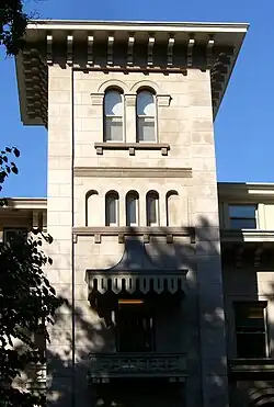After the 1860s, Austin's style changed with the times, incorporating structures in the Second Empire and Stick styles. In 1868, he constructed two Second Empire houses on Prospect Street in New Haven for Oliver Winchester and John M. Davies. The Winchester House has been demolished, but the Davies house remains, having been restored by Yale and renamed the Betts House. Austin's son, Fred, joined his father's practice in later years, but the firm did not survive long after Austin's death. Throughout his later years, Austin maintained control of his firm and was famous as he aged for wearing a dark brown wig.[10] He was the chairman of the Board of Commissioners of Public Buildings in New Haven at the time of his death;[2] he also served on the New Haven city council in 1854 and belonged to the Masons for fifty years.[11] In recent years, curiosity has been raised about Austin's professional relationship to his New Haven contemporary, Sidney Mason Stone,[12] but, other than minor references to civic duties they shared, there seems to be little documentation available to fuel such an inquiry.