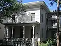 1850 | New Haven, Connecticut, Wooster Square | Nelson Hotchkiss House This was the first house Austin designed for Nelso Hotchkiss with whom he had worked closely. The windows are surrounded by Austin's signature, notched surrounds. The house also features a delicate canopy over the central three part window.[24] This house is part of a series of villas Austin designed on Chapel Street. |