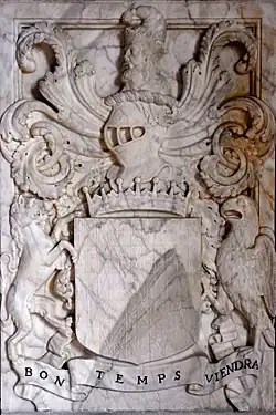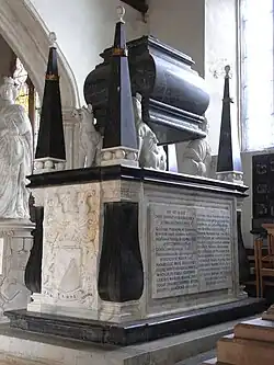 His widow erected in the south aisle chapel of Tawstock Church a large monument to her husband,[b] deemed "splendid" by Pevsner,[22] "massive and ugly" by Hoskins[23] and "almost unequalled in singularity and absurdity" by Marland.[24] It consists of a free standing base of black and white marble on which sit four white marble dogs supporting on their shoulders a big black square bulging sarcophogus. On each of the four corners is a black obelisk.[22] On the sides of the base is a lengthy epitaph in Latin.[25]
