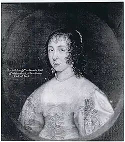 Rachel, daughter of Francis Fane, the first Earl of Westmoreland. She was first married to Henry Bourchier, Earl of Bath; secondly, to Lionel Cranfield, the third Earl of Middlesex, who succeeded his brother James in 1651. Lionel died without issue by her, 26 Oct 1674. I have seen her picture at Basilden, in Berkshire [near Granger's Shiplake], among the ancestors of the late Lord Viscount Fane. She is said to have left a very large sum to build a private chapel, but the money was never applied to the use for which it was intended. Lord Fane used to speak of her as a very good woman. Her portrait was painted by Vandyck, in the reign of Charles I. The print should have been inscribed, "Lady Rachel Fane, or Rachel Countess of Bath." Anachronisms of this kind are too common upon portraits.[34]