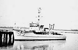 The tour in Bunting proved extremely rewarding, though not without its challenges. Her mission was to identify and plot all minelike objects in the Mayport Channel and approaches to maintain an accurate plot that, in the event of war and Soviet mining of the channel, would enable ships to distinguish real mines from false positives. The challenge of the mission was distinguishing objects moving with the current. Merchant ships constantly added heavy trash to the bottom. Mustin quickly realized that his mission was essentially a "make-work operation."[1] He thus appreciated the need to build morale. Every time the carriers would deploy, the air station band would play, making for a ceremonious occasion, to the delight of both crew and dependents. He asked that the band extend the same courtesy to Bunting whenever she deployed to Norfolk, and he got it. Moreover, when Bunting returned to her berth along the south wall, he would have his sea detail on deck to render honors to any carrier tied alongside the north wall. The relatively tiny Bunting, however, would steam past the much larger ship unseen, below the sight of the Officer of the Deck, and thus the carrier never returned honors. Mustin's annoyance led him to pay a call on the executive officer of USS Saratoga (CV-60), then the flagship of RADM George Anderson. After hearing his complaint, the good-natured Executive Officer assured him that the carrier would rectify the oversight. The next time the Bunting rendered the Saratoga honors, "all six of our sea detail came to attention and hand saluted, and six hundred guys returned it," said Mustin. "My guys loved this."[1]