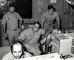 Glory thus snatched, Lawrence remained at sea for 80 days, steaming in circles with the nuclear carrier USS Enterprise (CVN-65) and other ships. Early in the quarantine operation, the navy had begun to make plans to invade Cuba, but as Mustin discovered later, commandant of the Marine Corps GEN David M. Shoup determined that, despite the eight carriers involved in the operation, the navy did not have enough firepower to support an amphibious assault. The Iowa-class battleships that had provided shore bombardment during the Korean War had all been decommissioned and mothballed in the late 1950s and consequently the force had no guns larger than 5-inch. Recognizing the lack of fire support, Shoup soon became very vocal in his objection to continued construction of the new Leahy-class guided missile Destroyer Leader (DLG). It had no guns except a 3-inch saluting battery amidships. Eventually, the navy put a 5-inch gun on the fantail of the final seven. At the operational level, the crisis devolved for Mustin and the engineering department into a major test, one that they passed. Fortunately, CAPT Brian McCauley, the destroyer division commander, had been a chief engineer and recognized the challenge. Mustin believed that McCauley's concurrent fitness report helped him get early selection for lieutenant commander.[1]