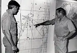 Thus advised, Mustin went to the bureau the following day and requested Vietnam duty. The response was not encouraging. "We're not sending any Naval Academy graduates over there," said his detailer. "That's for a bunch of [limited duty officers] and ex-enlisted men." Mustin persisted, but his detailer was unmoved. He offered Mustin a job as an aide in the Office of the Chief of Naval Operations, an offer he declined. Returning to the War College, he later received orders as flag secretary to the commander of naval forces in Vietnam. The Bureau gave him just ten days to get to Saigon.[1]