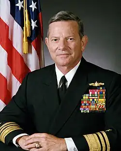 Born into an illustrious naval family on both his mother's and father's sides, Vice Admiral Henry C. Mustin furthered the family's reputation for service to country. His father’s side dated back to the War of 1812. His third-great-grandfather was Commodore Arthur Sinclair IV, who was voted a silver service by Congress for victories over the British in the Battle of the Great Lakes in 1812. And then there were a series of Arthur Sinclairs, one of whom commanded the stores ship Supply in Commodore Perry's expedition to open Japan. During the American Civil War another Arthur Sinclair, VADM Mustin's great-great-uncle, served in the Confederate States Navy with Captain Raphael Semmes in the CSS Alabama and fought in the Battle of Hampton Roads aboard CSS Virginia. Then down from that side, his grandfather and namesake, Captain Henry C. Mustin, was the first of many Mustins to attend the United States Naval Academy as a member of the Class of 1896. He was Naval Aviator #11 and considered by many to be the father of naval aviation, having established Naval Air Station Pensacola, being the first to be catapulted off a ship underway, and being in command of the aviation detachment that fought at the Battle of Veracruz, which was the first time that any U.S. aviator of any service was fired on by ground forces. Admiral Mustin's grandmother, Corinne Mustin, was a first cousin of Wallis Simpson, the Duchess of Windsor. When his grandfather Henry Mustin died, she remarried Admiral George D. Murray, Naval Academy Class of 1910. Murray was captain of the Enterprise during the Doolittle Raid and at the Battle of Midway, and was a close friend of Admiral Chester Nimitz. After the Japanese surrendered to the United States on board USS Missouri, Admiral Nimitz signed a copy of the picture to Admiral Murray with thanks. At the end of the war, he was the commander of the Mariana Islands, and accepted the Japanese surrender of the Caroline Islands aboard his flagship, the cruiser Portland (CA-33).[2][3] Admiral Mustin's great-uncle was General George Barnett, Naval Academy Class of 1881 and 12th commandant of the U.S. Marine Corps. Mustin was the third generation of his family to attend the US Naval academy. His father, Vice Admiral Lloyd M. Mustin, was Naval Academy class of 1932. His brother and one of his sons also graduated from Annapolis. Mustin said: "I’m the class of ’55, my brother, Tom, is the class of 62, and my youngest son, John, is the class of ’90."