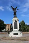 In October 1919, as World War I was drawing to a close, the Royal Academy in London held an exhibition of war memorial designs.[8] At the exhibition Fehr displayed statuettes of three figures, Peace holding a dove, a winged Victory and Saint George with a sword and shield.[8] Bronze statues of these figures appeared on several of the war memorials that Fehr created throughout the 1920s for British towns and cities. All three figures positioned on, or around, a stone obelisk, featured on the memorials Fehr created at Colchester, at Burton-upon-Trent, and, in different versions, on the Leeds War Memorial.[9][10] Several other memorials, including those at Lockerbie and Langholm in Scotland, at Eastbourne and at Grangetown in Cardiff, only featured the figure of Victory, holding a laurel wreath and an inverted sword, on a pedestal or obelisk.[8][9] The memorial at Keighley has a version of Peace with bronze statues of an infantryman in battle dress and a sailor holding a telescope.[10][11]