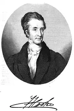 Henry Cooke came from a family of Puritan settlers in County Down from Devonshire. His family was described as "narrow minded Calvinistic conservatives, well noted for their anti-Catholic prejudices."[1] He was the youngest son of John Cooke, tenant farmer of Grillagh, near Maghera, County Londonderry, by his second wife, Jane Howie or Howe, of Scottish descent, and was born on 11 May 1788. From his mother, he derived his force of character, his remarkable memory, and his powers of sarcasm. A vivid impression, retained through life, of the events of 1798—the Irish Rebellion—influenced his political principles. After struggling for an education in rude country schools, he matriculated at Glasgow College in November 1802. Owing to illness he did not graduate, but he completed the arts and divinity courses, not shining as a student, but taking immense pains to qualify himself as a public speaker. Fresh from Glasgow, he appeared before the Ballymena presbytery in the somewhat unclerical attire of blue coat, drab vest, white cord breeches and tops, proved his orthodoxy on trial, and was licensed to preach.[2]