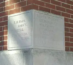 The cornerstone is found on the northeast corner of the building. On its east-facing side, the name R. H. Hunt is indicated as architect and E. M. Wallen as builder along with the year 1896. On its north-facing side are the names of the building committee: I. M. Hudson, Chairman; W. A. Carter; I. W. Morgan; A. B. Lamb; M. H. Freeman; and I. A. McSwain, Secretary.