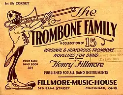 Fillmore gained fame as the "Father of the Trombone Smear",[9] writing a series of 15 novelty tunes featuring trombone smears called "The Trombone Family". A number of these have a strong ragtime influence. The tunes have subtitles printed on the parts, some of which contain racial slurs. Many were advertised specifically for the minstrel performers of the era. [10] All of Fillmore's trombone rags are as follows: