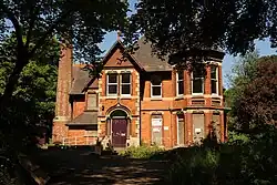 - St Swithins Parsonage 15 Lindum Terrace, Lincoln. 1871. Red brick with black banding running round the building at second storey level and contrasting red and black bricks used for window voussoirs. Iron cresting to roof ridges. Now the Hillcrest Hotel.[53]