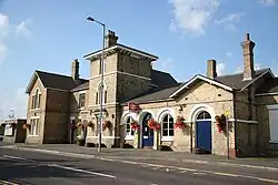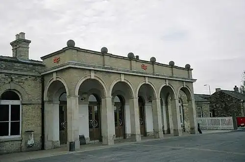 By 1848 Henry Goddard was appointed architect to the Great Northern Railway. This was after King's Cross had been built by Lewis Cubitt and branch lines from Lincoln to Boston, Gainsborough, Peterborough and Grimsby had been completed. He was responsible for all the new main line stations between King's Cross and Doncaster.[16] The new main line ran through Peterborough,[17] Newark and Retford and was fully operational by 1852. He was also the architect for Boston railway station which opened 1850.[18] Many of Goddard's stations on the branch lines had tall towers, often placed centrally, as at Spalding. Apart from the railway stations, Goddard was also the architect for the Great Northern Hotels at Peterborough and at Lincoln.