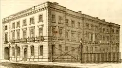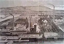 The rapid growth of Lincoln in the mid to late 19th century provided considerable opportunities for undertaking architectural work for wealthy factory owners who were involved in the engineering and metalworking industries. This work involved the design and layout of factories, the provision of housing, the laying out of new streets and the construction of the villas and residences of the factory owners. The Goddards seem to have developed a close relationship with Joseph Ruston who was the managing director of Ruston, Proctor and Company. The Goddards were are likely to be the architects of his house, Monk's Manor on Greetwell Road in Lincoln. They also provided new offices for Ruston Proctor on their Stamp End Sheaf Works[43] Joseph Ruston also financed the building of the Drill Hall in Broadgate for which Goddards were the architects.[44] The Goddards also undertook extensive design work for Clayton & Shuttleworth who occupied the adjacent site to Ruston Proctor at Stamp End. A print of 1865 of their ironworks would suggest that they had been closely involved in the layout of the factory. An Italianate tower in the central foreground appears to be a hallmark of their work and is seen again on the Great Northern Hotel depot building and on Ruston's Monk's Manor. They were to add further offices to this complex in 1878.[45] The Goddards also designed Hartsholme Park for Joseph Shuttleworth. Another factory complex that was laid out by the Goddards was the new Wellington Foundry on the Derby Farm in New Boultham in 1883.