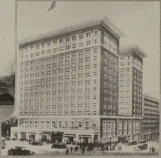 Following the mansion's demolition, construction began on a hotel at the site.[8][1] The state government still owned the land,[9][10] as well as the newly constructed hotel building.[11][12] As a result, state taxes were not required to be paid by the operators of the building, but the government would generate revenue from it by leasing the hotel to private hotel managers.[13] The building, designed by Atlanta-based architect G. Lloyd Preacher,[14] was named the Henry Grady Hotel, after noted Atlanta journalist Henry W. Grady.[9] The building was erected during a construction boom that was going on in the city and was one of several large hotels built during this time, which included the Hotel Ansley, the Atlanta Biltmore Hotel, and the Winecoff Hotel.[15][16][17][18] In an article published by the Atlanta Chamber of Commerce during the hotel's construction, they stated that the Grady would be "one of the largest and most centrally located hotels in the city".[19] The hotel was completed before Thanksgiving[20] in 1924,[8][1] with an estimated cost of $1 million.[21]