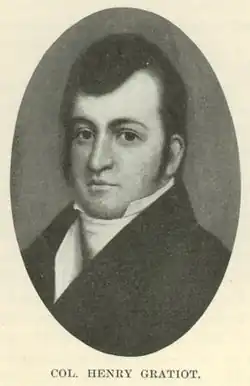 Colonel Henry Gratiot (April 25, 1789 – April 27, 1836) was a French-American pioneer, farmer, and mill owner. During the Winnebago and Black Hawk Wars, he acted as both an intermediary and early U.S. Indian agent to the Winnebagos throughout the early 19th century.[1] He and his brother Jean Pierre were among the first pioneers to settle in Wisconsin, operating a successful lead mining and lead smelting business, during the 1820s and 1830s. Both, the present-day village of Gratiot, Wisconsin and the town of Gratiot (town), Wisconsin are named in his honor.[2]