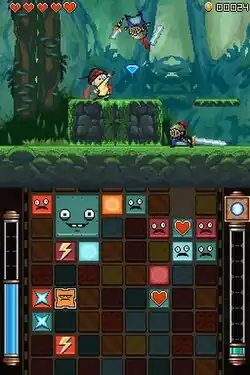 While the game is an action-platformer on the top screen, once enemies are defeated by Hatsworth, they are sent to the bottom screen as puzzle blocks.[1] The puzzle game on the bottom screen plays much like Nintendo's Puzzle League, as blocks need to be linked in a chain of three or more of the same color to be cleared, and any blocks resting on top of the cleared ones will fall into their place, potentially leading to a chain reaction of blocks being cleared if they fall into place and end up touching more of the same colors.