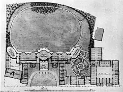 Holland is perhaps best remembered for the original Marine Pavilion (known as such from 1788)[28] (1786–87) at Brighton, Sussex, designed for the Prince of Wales. The Prince had taken a lease on a farmhouse in October 1786[29] in the centre of Brighthelmstone, then little more than a village. From 1788 Holland began transforming the building,[30] the east front had two double height bows added, to the north the present saloon was created circular in plan with two apses to north and south, the exterior was of the form of a large bow surrounded by Ionic columns, and to the north of that the farmhouse copied, the west front was quite plain, a tetrastyle, Ionic portico in the centre flanked by two wings forming an open court. Holland proposed further alterations to the pavilion in 1795,[31] but due to the Prince's financial problems were delayed and it was not until 1801[32] that any work was carried out, this involved extending the main facade with wings at 45 degrees to north and south containing an eating room and conservatory (these were later replaced by Nash's Banqueting and Music rooms) and the entrance hall was extended with the portico moved forward, and three new staircases created within. In 1803 Holland produced a design to remodel the Pavilion in Chinese style[33] but this was not executed.