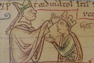 The young king inherited a difficult situation, with over half of England occupied by the rebels and most of his father's continental possessions still in French hands.[23] He had substantial support from Cardinal Guala, who intended to win the civil war for Henry and punish the rebels.[24] Guala set about strengthening the ties between England and the papacy, starting with the coronation itself, where Henry gave homage to the papacy, recognising Pope Honorius III as his feudal lord.[25] Honorius declared that Henry was his vassal and ward, and that the legate had complete authority to protect Henry and his kingdom.[19] As an additional measure, Henry took the cross, declaring himself a crusader and so entitled to special protection from Rome.[19]