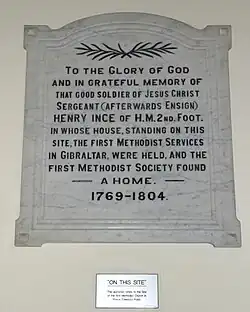 According to Gibraltarian Methodist tradition, the colony's first regular Methodist meeting place was Ince's old home on Prince Edward's Road – a claim which is made on a plaque that was originally mounted in the Methodist Church on Prince Edward's Road and is now in the modern Gibraltar Methodist Church on Main Street. However, there is no evidence to support this; according to Ince's own correspondence to Wesley, he hired a room in which the Methodists could meet, rather than using his own home, and the site on Prince Edward's Road where the first Methodist Church was built was leased to another man during Ince's lifetime. He is recorded as owning property elsewhere in Gibraltar, on the east side of Main Street.[4]