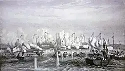 Promoted to commodore, Keppel became second-in-command of the East Indies and China Station, with his broad pennant in the frigate HMS Raleigh, in September 1856.[3] HMS Raleigh was lost on an uncharted rock near Hong Kong, and, although Keppel was subsequently court-martialed, he was honourably acquitted for the loss of the ship. He then transferred his pennant to the sixth-rate HMS Alligator.[9] After commandeering the chartered steamer Hong Kong, he commanded the British squadron, which consisted of the Hong Kong and seven gun boats, in the action with Chinese pirates at the Battle of Fatshan Creek in June 1857 when he sank around 100 enemy war-junks.[3] For his part in this action Keppel was advanced to Knight Commander of the Order of the Bath on 12 September 1857.[10] He also took part in the capture of Canton in December 1857 during the Second Opium War.[3]