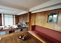Privately, Kulka realized over 40 fine wooden houses throughout New Zealand. His wooden houses were innovative in their spatial and material resolution. The Halberstam House in Wellington (1948)[16] is an excellent example of Kulka's ability to design compact minimal dwellings. The single level bungalow sits on top of a small hill in Wellington. It had a very modest construction budget and post war building restrictions were imposed on the commissioners. Notwithstanding these constraints, Kulka built a striking cubic bungalow clad with dark stained weather boards on the exterior with the uplifting surprise of a luminous and calming interior consisting of fine honey coloured native wood panels and clean fibrous plaster. In this modest sized family home a small piano nook is built subtly into the lounge. This nook is separated from the main body of the lounge by the minimal gesture of a bookcase which projects a little into the lounge.[17] A small lowered ceiling above the nook adds to the sense of separateness, snugness of this sub-space. Built in seating on either side of a fireplace are positioned toward the view of northerly hills, and the light. Cosiness, economy and functionality are brought together to achieve a sense of gentle refinement. Notwithstanding the Halberstam villa's more modest scale compared to other Kulka Houses in New Zealand, it remains exemplary of the spirit of his work spatially and materially. Kulka's prolific building continues to influence Modern Architecture in New Zealand.