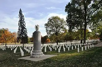 General Leavenworth died in the Cross Timbers in the Indian Territory, on land near modern Kingston, Oklahoma, on July 21, 1834,[4] of either sickness or an accident while buffalo-hunting;[5] while leading an expedition against the Pawnee and Comanche. His regiment erected a monument at Cross Timbers; he was first buried in Delhi,[6] with his remains later reinterred at Fort Leavenworth National Cemetery.[7]
