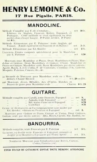 Lemoine was the publisher for Frédéric Chopin,[2] Augustine Renaud d`Allen,[4] Jeannine Richer,[5] Elise Rondonneau,[6] Mme H. Servier,[7] Charlotte Tardieu,[8] Marcelle Villin, and many others. In 1844 he published Hector Berlioz's Traité d'orchestration.[2]