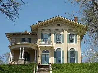 The Italian Villa style house was designed by Davenport architect W.L. Carroll.[6] Contracts for construction were let in 1868 to Frank Kurk as the contractor and Frank Noe for the brickwork. It sits high on a bluff above the street. In 1874 Lischer and his son-in-law and next door neighbor Frederick G. Clausen built the stone wall and the staircases that led from the sidewalk to their respective residences.[7]