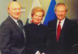 McLeish travelled to the United States in April 2001 where he met with President of the United States, George W. Bush, in the Oval Office at the White House.[40] The following day, McLeish was criticised over his decision to appointment a Scottish ambassador to Washington D.C. which was described as "a threat to the future of the United Kingdom". McLeish announced that the role of the ambassador in the United States would be largely promoting Scotland and its image in the United States.[41]