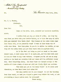 - ^ "Correspondence to Superintendent Turner," 18 July 1912, Henry Miller Papers Collection, Special Collections, Henry Madden Library, California State University, Fresno