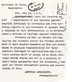 Although the safety of American citizens in the Ottoman Empire, mostly Christian missionaries and Jews, loomed large early in his ambassadorship, Morgenthau said that he was most preoccupied by the Armenian Question.[28] After the outbreak of war in 1914, the U.S. remained neutral, so the American Embassy – and by extension Morgenthau – additionally represented many of the Allies' interests in Constantinople, since they had withdrawn their diplomatic missions after the beginning of hostilities. As Ottoman authorities began the Armenian genocide in 1914–1915, the American consuls residing in different parts of the Empire flooded Morgenthau's desk with reports nearly every hour,[29] documenting the massacres and deportation marches taking place. Faced with the accumulating evidence, he officially informed the U.S. government of the activities of the Ottoman government and asked Washington to intervene.[30]